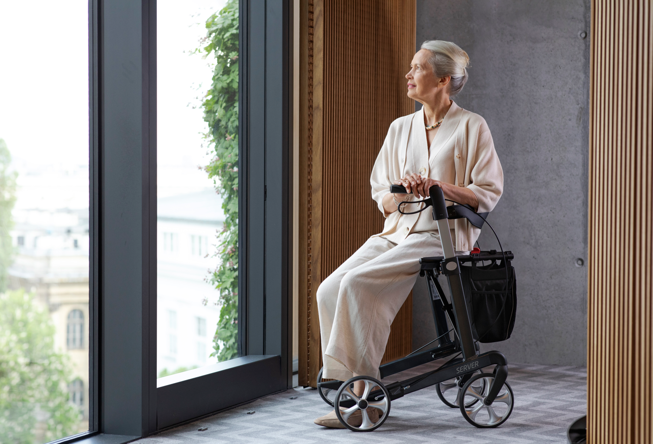 The SERVER is the classicaluminum lightweightrollator. The timelessly elegantframe is inspired by thepurist style of Danish Design.Thanks to the unique profilethe rollator can be easilykept clean and maintained.The ergonomic handle gripsunder the "Click & Safe" safetycatch allow secure lifting,carrying and transporting ofthe rollator.In the XL version the SERVERis available as the SERVER HD.