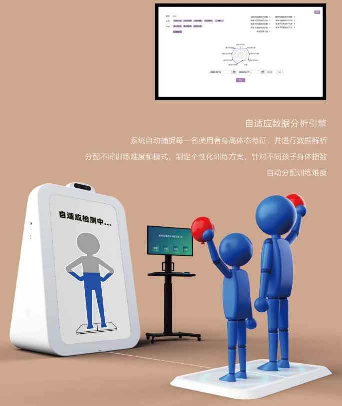 Limb Coordination Interactive Training System adopts core technologies such as an adaptive learning engine and data analysis engine to conduct comprehensive assessment and targeted training for children's upper limbs, lower limbs, and posture. The system features built-in assessment functions, allowing therapists to perform systematic evaluations for each child, such as assessing muscle strength balance, coordination, and other factors in a scientific manner. The big data engine compares and analyzes assessment results, automatically generating evaluation reports. All functional indicators are presented in digitized and graphical formats for clear visualization, facilitating therapists in querying, exporting, and archiving data.
