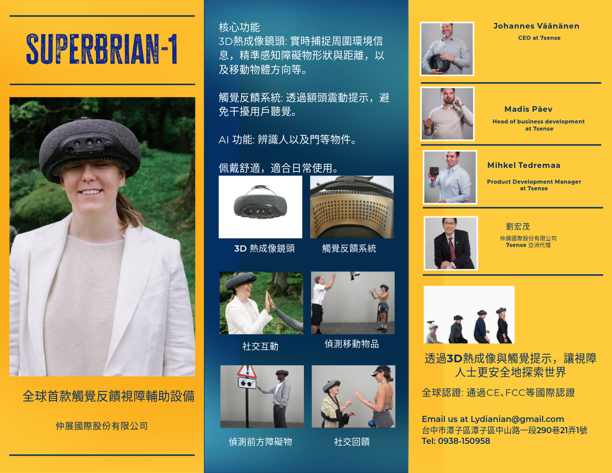 SuperBrain 1 is more than just an assistive device; it opens up a whole new dimension of perception for the visually impaired. Developed by 7Sense and exclusively distributed by Chung-Chan International, this groundbreaking wearable device will revolutionize how you understand and interact with the world around you. Bid Farewell to Commands, Embrace Freedom Traditional assistive devices for the visually impaired often rely on voice commands, limiting user autonomy. SuperBrain 1 is fundamentally different. It utilizes advanced 3D vision, point cloud technology, and thermal cameras to transform environmental information into a high-resolution 'haptic space.' You will experience subtle tactile feedback on your forehead, as if possessing 'phyxels,' precisely perceiving the shape, size, distance, and movement of objects. SuperBrain 1 is fundamentally different. It utilizes advanced 3D vision, point cloud technology, and thermal cameras to transform environmental information into a high-resolution 'haptic space.' You will experience subtle tactile feedback on your forehead, as if possessing 'phyxels,' precisely perceiving the shape, size, distance, and movement of objects.Beyond Sight, Perceive All Things SuperBrain 1 bestows upon you superhuman perceptual abilities. It enables you to: • Precise Obstacle Avoidance: Sense obstacles above your waistline, moving people, and vehicles, ensuring your every step is safe and secure. • Situational Awareness: Form a comprehensive understanding of your surroundings through haptic feedback, enhancing your spatial awareness. • Rapid Reaction: React faster to moving objects, whether pedestrians or bicycles, allowing for timely detection. • Omnidirectional View: Even perceive movements behind or above your head, granting you a 'back-of-the-head' sensitivity. • Breakthrough Limitations: Sense information imperceptible to the naked eye, such as infrared and ultraviolet, expanding your perceptual boundaries. Lightweight, Comfortable, and Effortless SuperBrain 1 features an ergonomic design with balanced weight, ensuring comfort even during prolonged wear. The battery lasts up to 3 hours and supports fast charging and power banks, allowing you to explore without worry. Its intuitive and easy-to-learn interface means you can get started in minutes, quickly integrating it into your daily life. Your Independence, Our Mission SuperBrain 1 aims to enhance the independence and quality of life for the visually impaired. It seamlessly integrates with your existing assistive tools like white canes and guide dogs. We believe that through this innovative technology, every user can regain the confidence to move freely and bravely explore endless possibilities. Experience SuperBrain 1 today and discover the unprecedented 'remote sense of touch,' embarking on your journey of super perception!