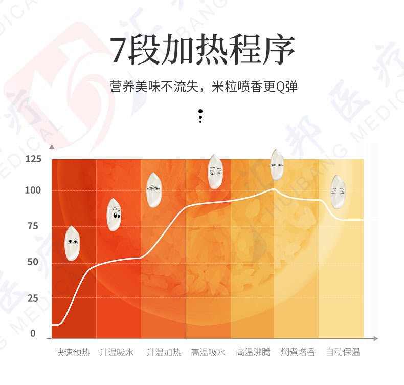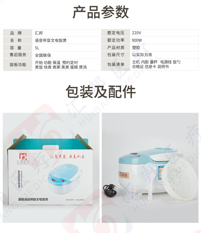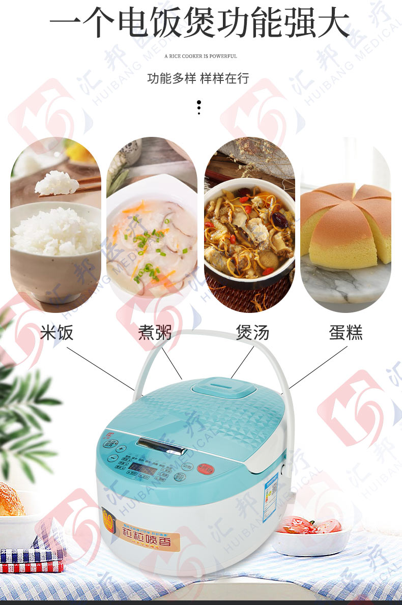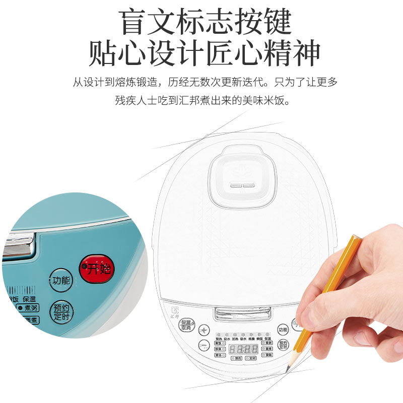 具有全程語音提示功能;精煮、快煮、煲湯、煮粥、蒸煮、蛋糕、保溫、預(yù)約/定時八大功能,并且都由獨立按鍵控制;功能按鈕帶盲點標識及LED指示燈;烹飪完成后語音播報“烹飪結(jié)束”并進入保溫模式,保溫模式下,按下任何按鍵播報之前的“烹飪功能及烹飪結(jié)束”語音;具有顯示屏:一個LED四位數(shù)碼顯示屏可顯示預(yù)約定時信息,另一個顯示屏可顯示精煮的7段過程:預(yù)熱、吸水、加熱、吸水、沸騰、燜飯、保濕。