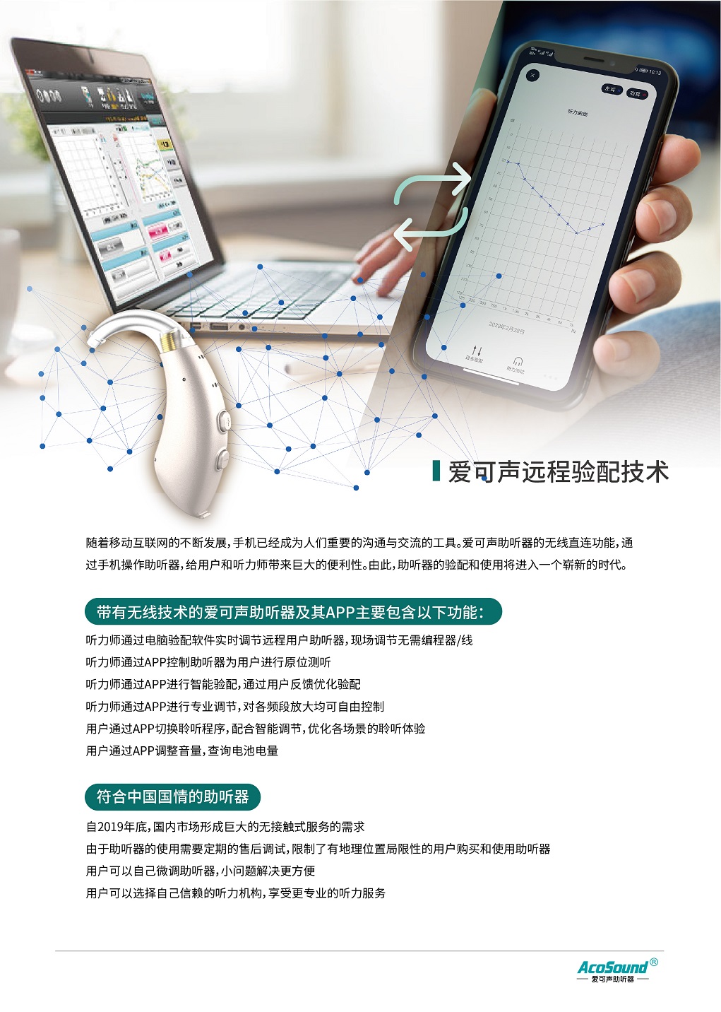 驗配師遠程實時調試用戶助聽器,提升用戶在日常生活中的聆聽體驗 精準驗配:實時、高效 溝通無界:隨時、隨地 遠程服務:省時、省力