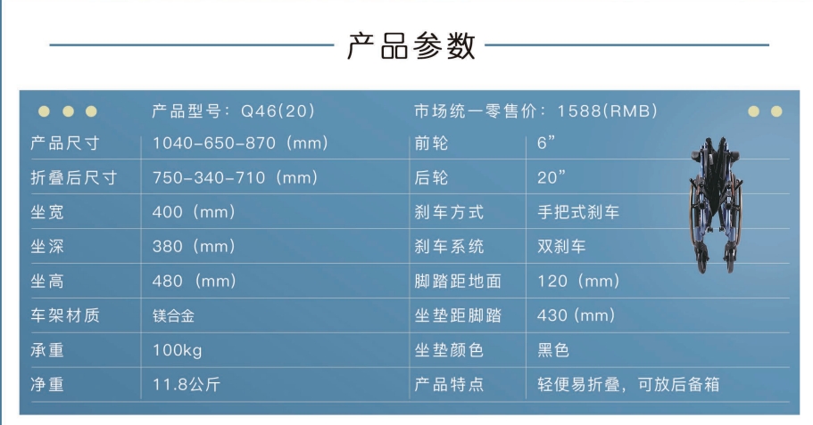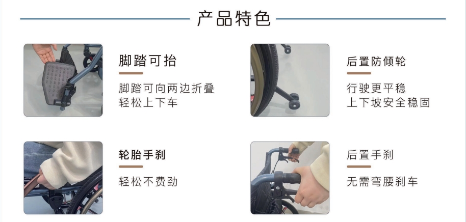 1、鎂合金大輪手推輪椅,推行超輕松,凈重11公斤 2、左右對折腳踏,可上翻,方便上下車 3、可自劃,可推行 4、前后雙剎車,安全穩(wěn)定 5、加長防傾輪,有效防止傾倒