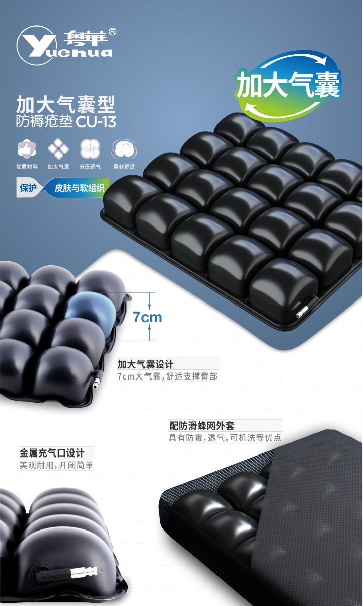 可分散臀部久坐所承受的壓力,促進(jìn)臀部干爽透氣,減輕皮膚和軟組織受到壓迫,預(yù)防和緩解壓瘡。 加大氣囊設(shè)計(jì),坐墊高度7cm,每個(gè)氣囊氣流相通,可更好承托臀部。 用于術(shù)后或長(zhǎng)期坐臥患者,預(yù)防和緩解壓瘡。