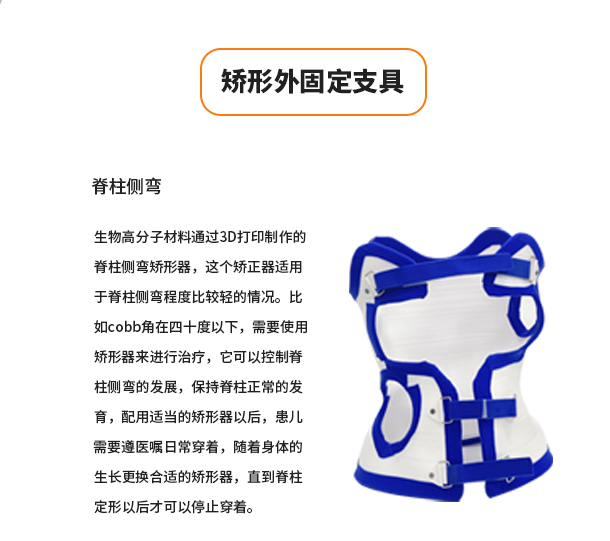 矯形外固定支具 脊柱側(cè)彎 生物高分子材料通過3D打印制作的脊柱側(cè)彎矯形器,這個矯正器適用于脊柱側(cè)彎程度比較輕的情況。比如cobb角在四十度以下,需要使用矯形器來進(jìn)行治療,它可以控制脊柱側(cè)彎的發(fā)展,保持脊柱正常的發(fā)育,配用適當(dāng)?shù)某C形器以后,患兒需要遵醫(yī)囑日常穿著,隨著身體的生長更換合適的矯形器,直到脊柱定形以后才可以停止穿著。