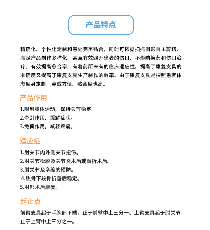 產(chǎn)品特點(diǎn) 精確化、個(gè)性化定制和患處完美貼合,同時(shí)可依據(jù)掃描圖形自主剪切,滿足產(chǎn)品制作多樣化,甚至有效避開患者的傷口,不影響換藥和傷口治療,有效提高愈合率,有著前所未有的臨床適應(yīng)性。提高了康復(fù)支具的準(zhǔn)確度又提高了康復(fù)支具生產(chǎn)制作的效率。由于康復(fù)支具是按照患者體態(tài)度身定制,穿戴方便,貼合度也高。 產(chǎn)品作用 1.限制肢體運(yùn)動(dòng),保持關(guān)節(jié)穩(wěn)定。 2.牽引作用,緩解癥狀。 3.免荷作用,減輕疼痛。