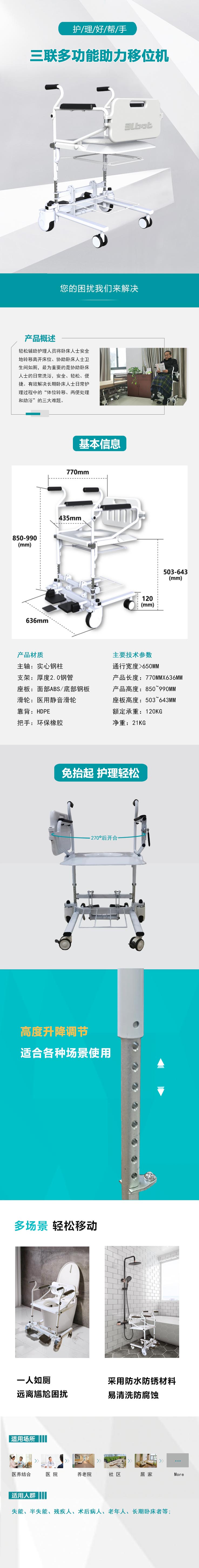 三聯(lián)多功能助力移位機(jī),輕松的解決了照護(hù)老人、殘疾人過(guò)程中移位、如廁、助浴的三大難題。產(chǎn)品獨(dú)創(chuàng)270°后開(kāi)合設(shè)計(jì),免抬起護(hù)理更輕松;高度可升降,適合多種場(chǎng)景;整體采用防水防銹材料,易清洗。