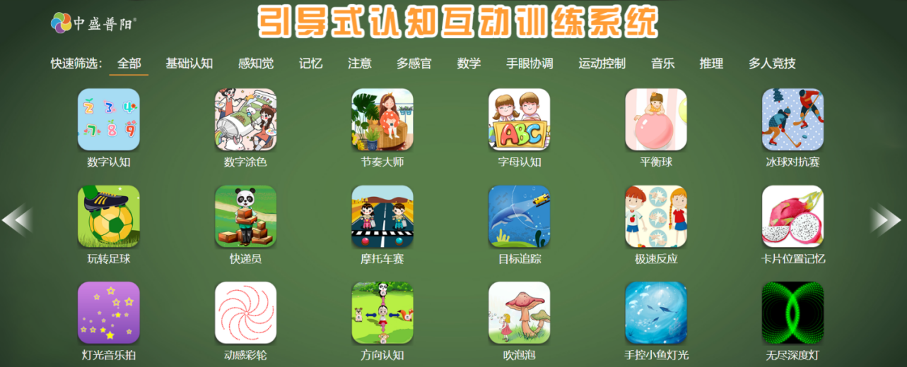 采用引導(dǎo)式教育訓(xùn)練方法,融合了神經(jīng)科學(xué)、康復(fù)醫(yī)學(xué)、心理學(xué)、特殊教育學(xué)等相關(guān)學(xué)科的康復(fù)教育體系。系統(tǒng)特點(diǎn)在于最大限度地引導(dǎo)調(diào)動兒童主動參與、主動學(xué)習(xí)的能力。通過融合圖文聲光等多媒體互動技術(shù)手段,輔助視覺、聽覺、觸覺等多感官訓(xùn)練,以豐富的內(nèi)容為用戶提供腦功能認(rèn)知訓(xùn)練和多感官運(yùn)動訓(xùn)練的專業(yè)設(shè)備。系統(tǒng)包括基礎(chǔ)認(rèn)知、感知覺、記憶、注意、多感官、數(shù)學(xué)、手眼協(xié)調(diào)、運(yùn)動控制、音樂、推理等11大類別的訓(xùn)練維度。