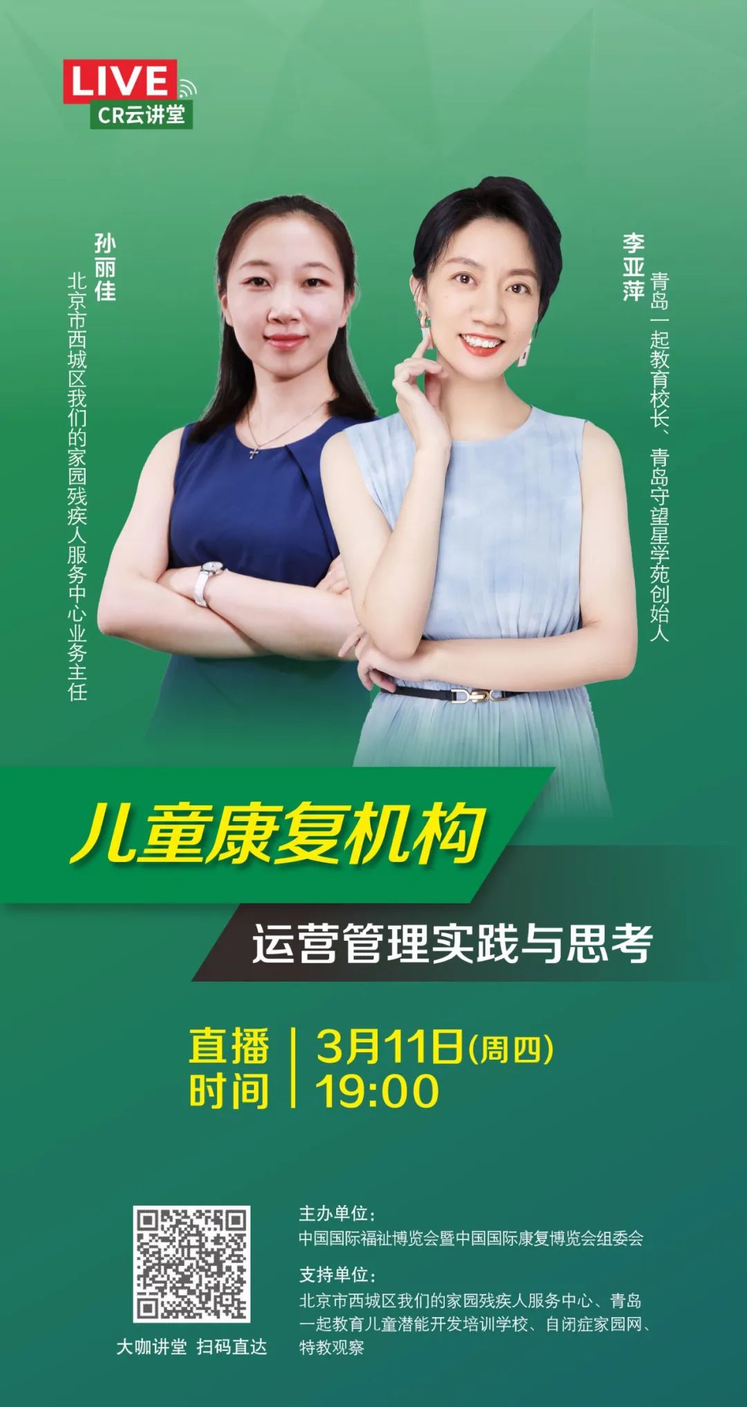 3月11日(周四),CR EXPO直播課邀請到青島一起教育校長李亞萍、北京市西城區(qū)我們的家園殘疾人服務中心業(yè)務主任孫麗佳,與大家分享“兒童康復機構運營管理實踐與思考”。