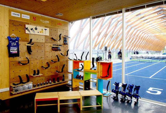 “大棚”下的60米田徑跑道 Brillia Running Stadium官網(wǎng) 圖走進(jìn)“假肢圖書(shū)館”,可以看到一整面墻上掛著各種各樣的假肢和配件。如果你看過(guò)殘奧會(huì)田徑場(chǎng)上 “刀鋒戰(zhàn)士”的風(fēng)采,那一定對(duì)這些細(xì)長(zhǎng)的“U”字型的裝置并不陌生,這里提供的就是和專業(yè)殘奧運(yùn)動(dòng)員一樣的碳纖維競(jìng)技型假肢。