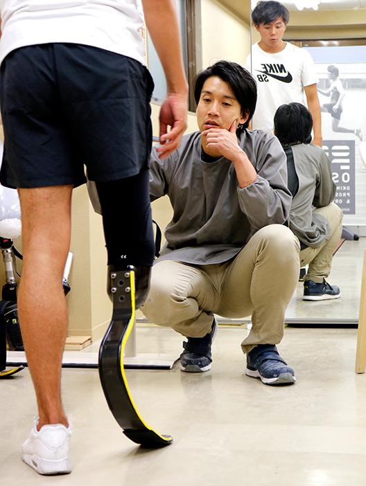 與日常行走的假肢不同,專業(yè)的競(jìng)技型假肢通常無(wú)法自己穿戴,需要專業(yè)人士進(jìn)行一對(duì)一的協(xié)助。他們通常被稱作“假肢裝具師”,沖野敦郎就是其中的一員。