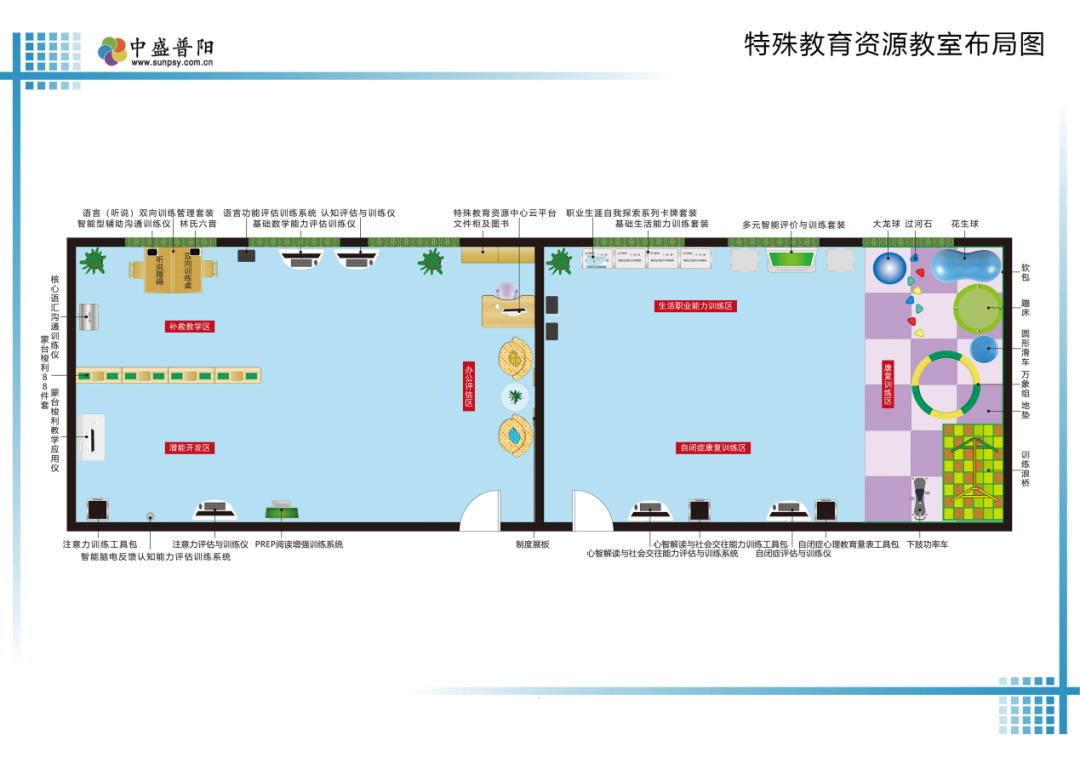 根據(jù)中盛普陽多年特殊教育隨班就讀資源教室的建設(shè)經(jīng)驗(yàn),及滿足“十四五”特殊教育發(fā)展提升行動計劃針對資源教室的建設(shè)要求,對于功能室布局分布如下: