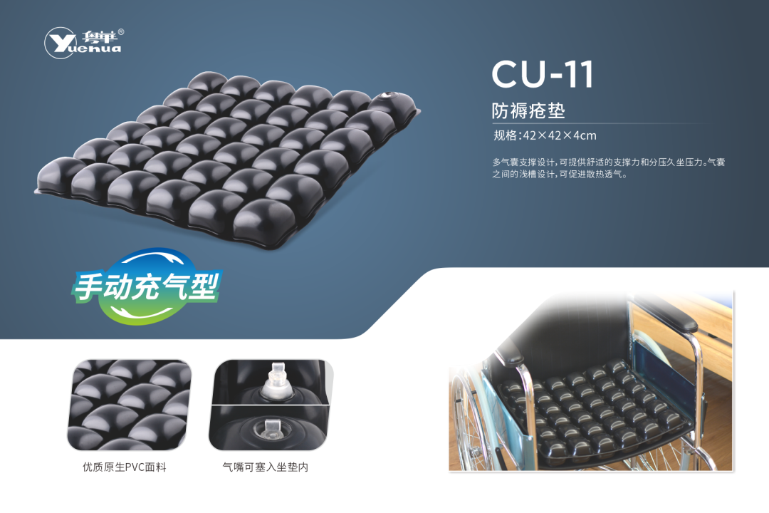 防褥瘡墊CU-11,多氣囊支撐設(shè)計,可提供舒適的支撐力和分壓久坐壓力。氣囊之間的淺槽設(shè)計,可促進散熱透氣。