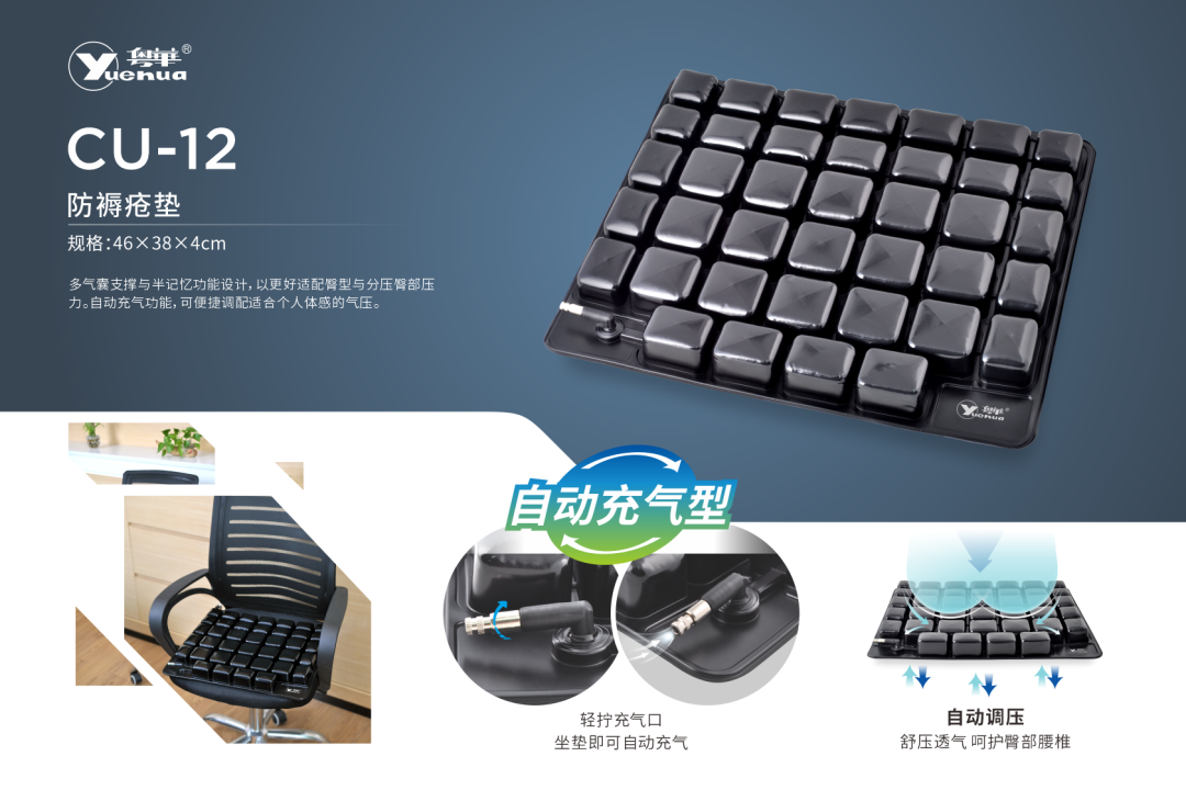 防褥瘡墊CU-12,多氣囊支撐與半記憶功能設(shè)計,以更好適配臀型與分壓臀部壓力。自動充氣功能,可便捷調(diào)配適合個人體感的氣壓。