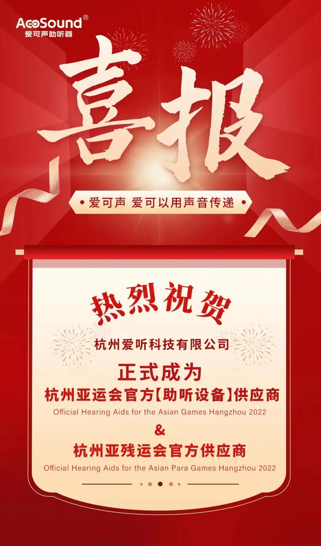 愛可聲作為杭州亞運(yùn)會官方助聽設(shè)備供應(yīng)商、WHO中國助聽器唯一供應(yīng)商、國家科技部重點(diǎn)研發(fā)計(jì)劃項(xiàng)目承接單位,深耕醫(yī)療賽道,積極投身到愛心公益陣列中,作為殘聯(lián)合作愛心企業(yè)在聽力篩查項(xiàng)目中不斷實(shí)踐,且多年來堅(jiān)持創(chuàng)新,不斷打磨產(chǎn)品質(zhì)量,為聽損朋友提供更為優(yōu)質(zhì)的服務(wù),希望所有聽損人士都能聽到家人愛的聲音!