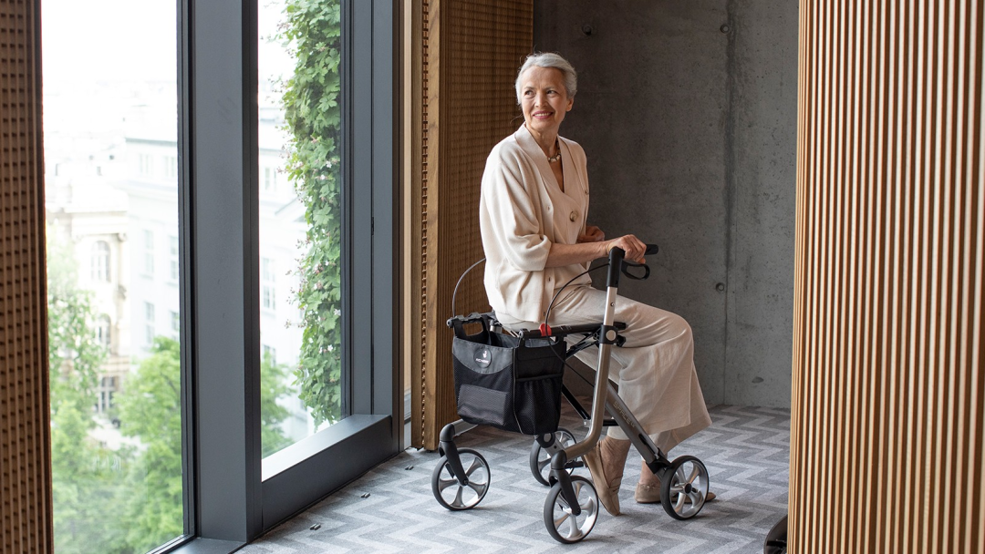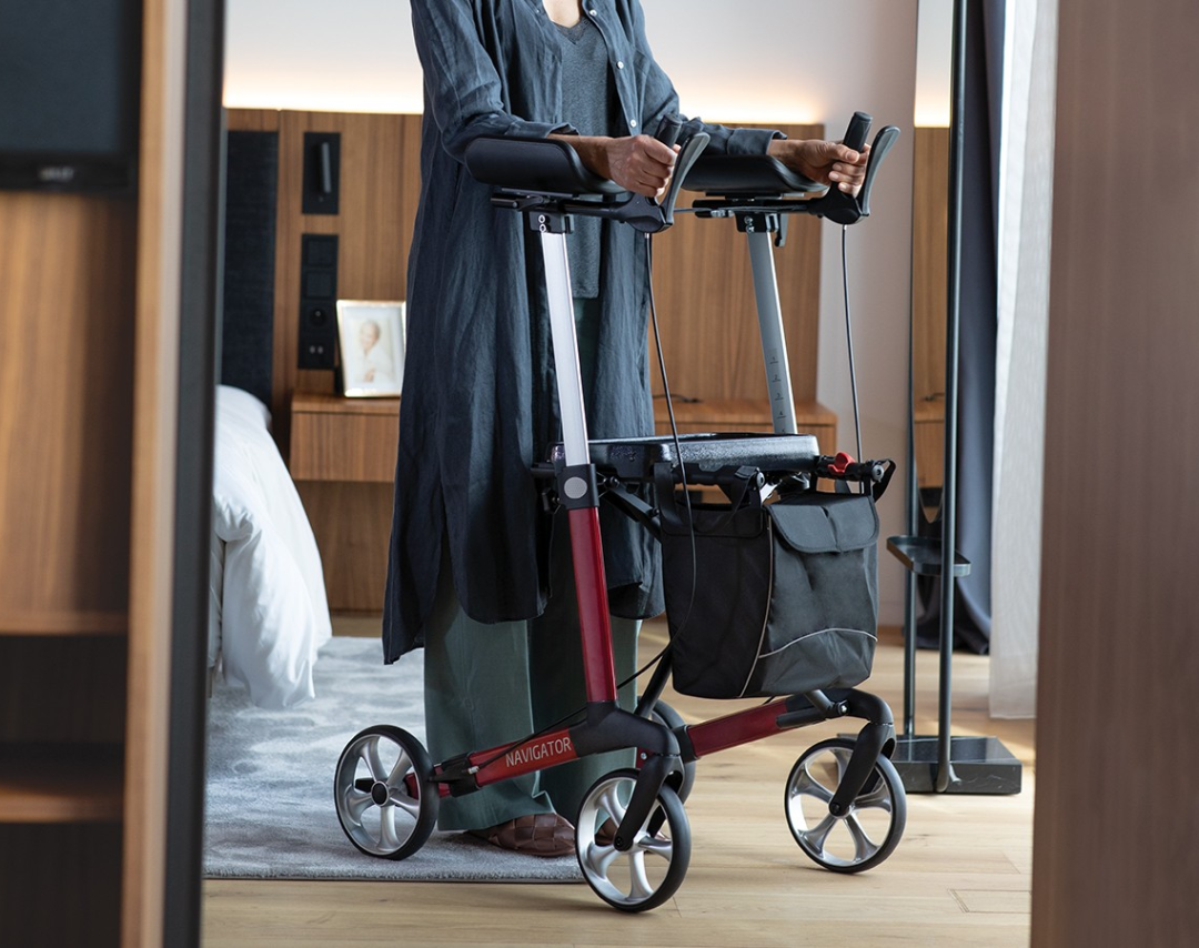 瑞云-航海家是為患有關節(jié)炎或手部功能受限的用戶開發(fā)的助行器,兼具功能性與舒適性。前臂支撐架主要由大尺寸的海綿墊和手剎組成,用戶通過手臂的力量推動助行器前行,有固定式和旋轉(zhuǎn)式兩種類型可旋轉(zhuǎn)的支撐架有三個調(diào)節(jié)角度,滿足不同用戶的需求。