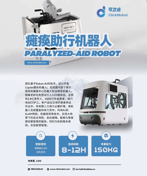 團隊基于Robot+AI的技術,設計開發(fā)Copilot服務機器人。完成國內首個用于醫(yī)院和康復中心的載人轉運服務機器人。隨著老齡化問題突出,全國2.8億老年人,4000萬失能患者,卻只有50萬護工。在康復中心的日常轉運作業(yè)中,用機器人完成重復和體力勞作。利用AI和SLAM導航,機器視覺等技術,實現(xiàn)大場景下的自主導航、自動避障。能夠為患者提供更智慧的服務,同時為機構降本增效,實現(xiàn)智慧管理。用機器完成轉運,讓護工照護患者。