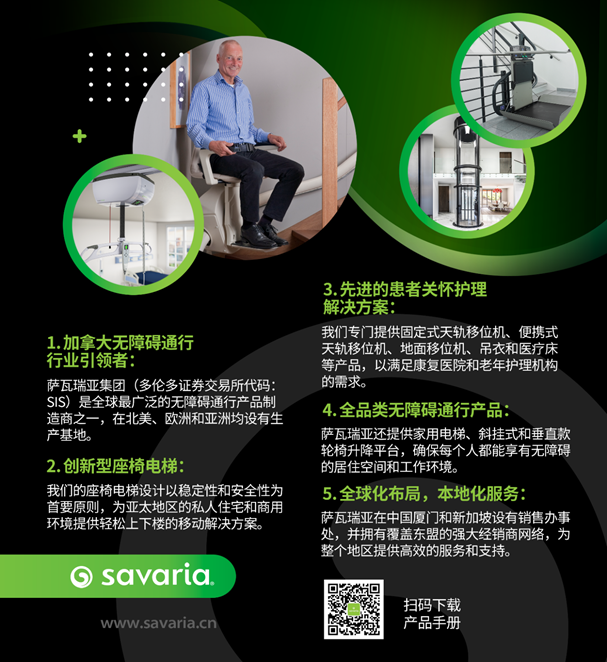 薩瓦瑞亞集團(Savaria)是全球無障礙通行解決方案的行業(yè)引領者,致力于提升個人在室內外自由出行的獨立性。我們設計、制造并安裝所有的無障礙通行產品,如座椅電梯、輪椅電梯、天軌移位機以及家用電梯,幫助人們在居住、工作和娛樂的空間上獲得更多靈活性。我們在全球范圍內擁有超過2300名員工,在北美、歐洲和中國設有17個生產基地,并在全球范圍內擁有30多個辦事處,以便更高效地服務全球市場,快速響應客戶地定制化需求。