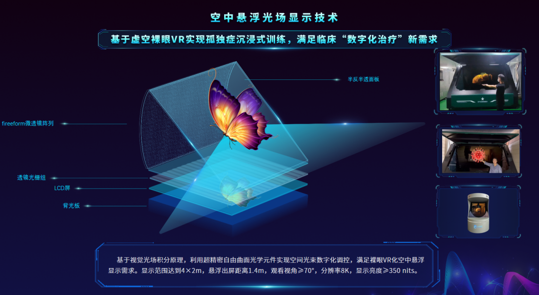 基于視覺光場(chǎng)積分原理,利用超精密自由曲面光學(xué)元件實(shí)現(xiàn)空間光束數(shù)字化調(diào)控,滿足裸眼VR化空中懸浮顯示需求。最大顯示范圍達(dá)到4×2m,最大懸浮出屏距離1.4m,觀看視角≥70°,顯示亮度≥350 nits。系統(tǒng)可通過(guò)采集用戶語(yǔ)音、姿態(tài)、手勢(shì)、眼神、面部表情等多模態(tài)行為學(xué)特征實(shí)現(xiàn)沉浸式、非接觸的隔空人機(jī)交互訓(xùn)練,滿足臨床“數(shù)字化治療”新需求。為當(dāng)前國(guó)內(nèi)最大顯示范圍、出屏距離裸眼VR系統(tǒng)。