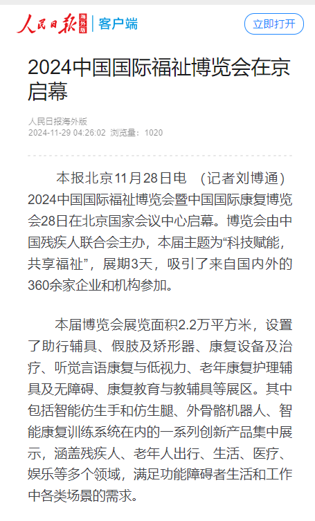 本報(bào)北京11月28日電 (記者劉博通)2024中國國際福祉博覽會(huì)暨中國國際康復(fù)博覽會(huì)28日在北京國家會(huì)議中心啟幕。博覽會(huì)由中國殘疾人聯(lián)合會(huì)主辦,本屆主題為“科技賦能,共享福祉”,展期3天,吸引了來自國內(nèi)外的360余家企業(yè)和機(jī)構(gòu)參加。