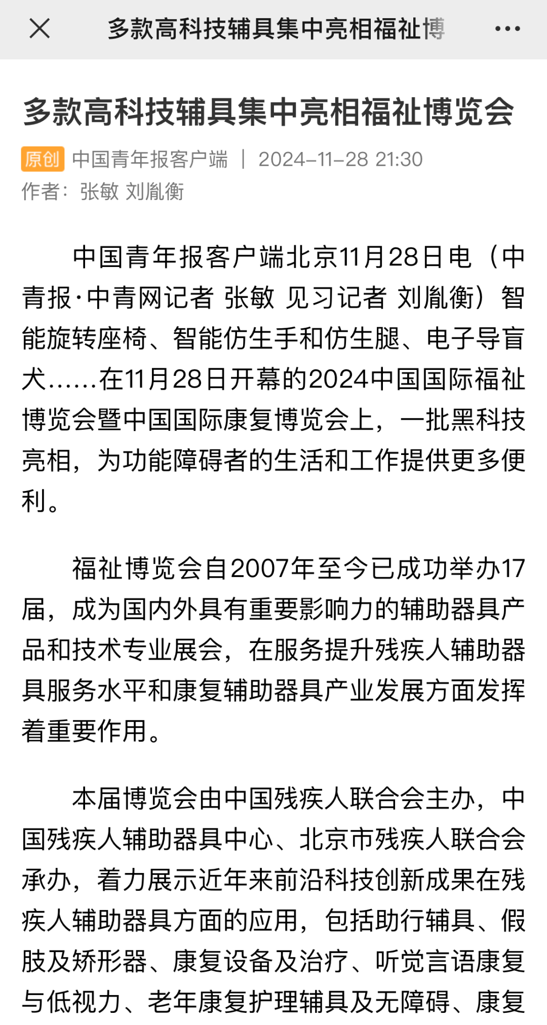 展會展示各類產(chǎn)品萬余件,包括外骨骼機器人、智能康復(fù)訓(xùn)練系統(tǒng)、能幫助聽障者無障礙交流的多語種AI透明屏、能幫助言語障礙者修復(fù)聲音的APP等一系列創(chuàng)新產(chǎn)品,涵蓋殘疾人、老年人出行、生活、醫(yī)療、娛樂等多個領(lǐng)域。