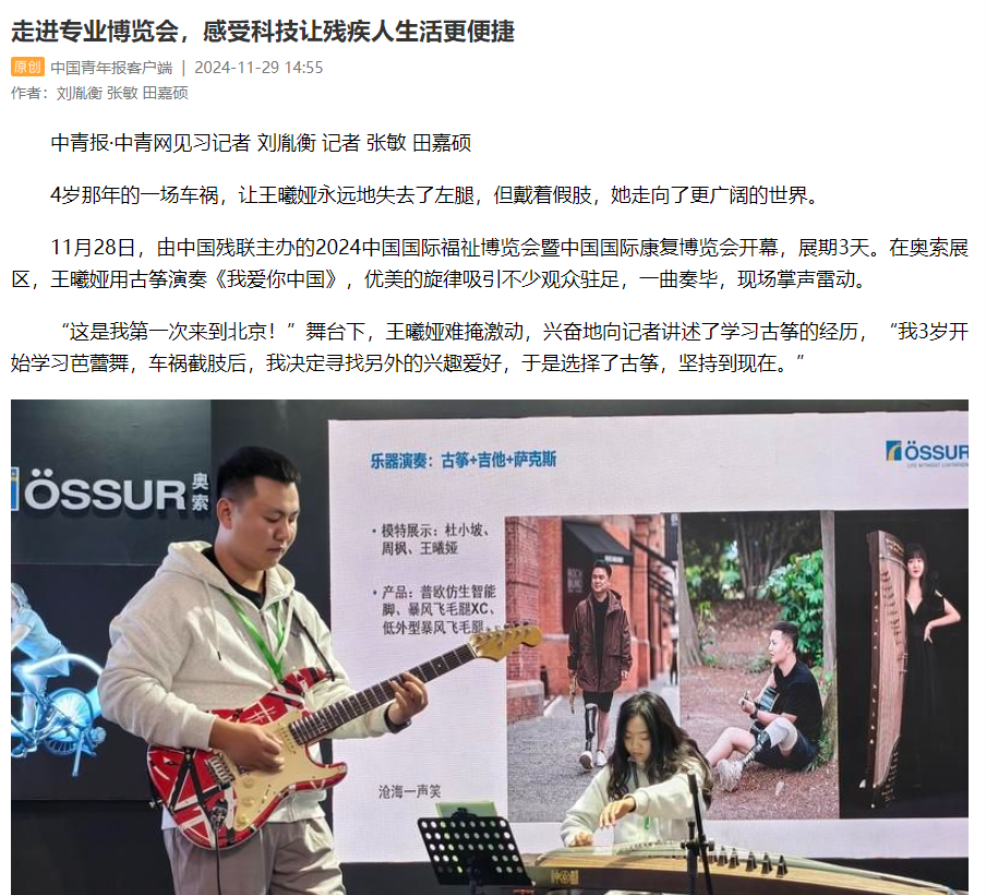 11月28日,由中國殘聯(lián)主辦的2024中國國際福祉博覽會暨中國國際康復(fù)博覽會開幕,展期3天。在奧索展區(qū),王曦婭用古箏演奏《我愛你中國》,優(yōu)美的旋律吸引不少觀眾駐足,一曲奏畢,現(xiàn)場掌聲雷動。