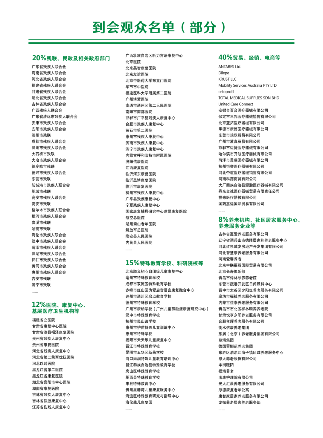 福祉博覽會是由中國殘聯(lián)主辦的國家級康復輔具產(chǎn)業(yè)盛會,涵蓋助行移動輔具、假肢及矯形器、康復及兒童康復、老年輔具、無障礙設施等多元化產(chǎn)品,匯聚了來自全球各地的專業(yè)買家和采購商,國內(nèi)買家包括全國各級殘聯(lián)系統(tǒng)、民政系統(tǒng)、醫(yī)療康復機構(gòu)、養(yǎng)老機構(gòu)、經(jīng)銷商等多元買家資源;海外買家來自德國、美國、荷蘭、瑞典等歐美國家,以及中東、日韓、東南亞、澳洲等國家和地區(qū)的醫(yī)療康復機構(gòu)、醫(yī)院、養(yǎng)老服務機構(gòu)、當?shù)亟?jīng)銷商、進出口貿(mào)易商等核心采購群體。