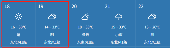 5月19日:陰,14-33℃,體感偏熱,需注意補(bǔ)充水分,避免中暑。