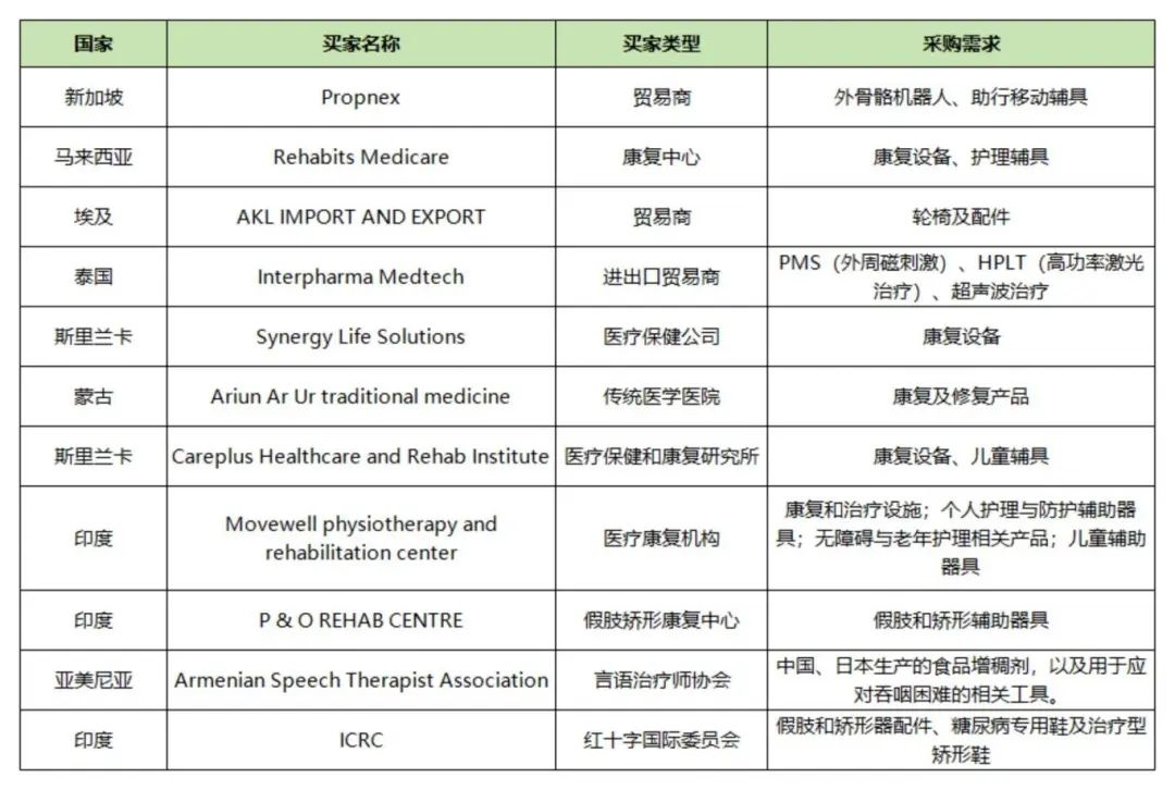 圍繞海外買(mǎi)家的采購(gòu)需求,福祉博覽會(huì)將在9月12日10:00-12:00在北京國(guó)家會(huì)議中心舉辦“海外買(mǎi)家商貿(mào)配對(duì)會(huì)”,來(lái)自埃及、新加坡、馬來(lái)西亞、泰國(guó)、印度、蒙古、斯里蘭卡等多個(gè)國(guó)家的專(zhuān)業(yè)買(mǎi)家,包括醫(yī)院、康復(fù)中心、假肢矯形中心、協(xié)會(huì)組織、貿(mào)易商等帶來(lái)真實(shí)、迫切的采購(gòu)需求。配對(duì)會(huì)將助力參展企業(yè)和海外買(mǎi)家高效對(duì)接,精準(zhǔn)洽談,將商機(jī)快速轉(zhuǎn)化為實(shí)實(shí)在在的訂單,是企業(yè)開(kāi)拓國(guó)際市場(chǎng)不可錯(cuò)過(guò)的“快車(chē)道”!
