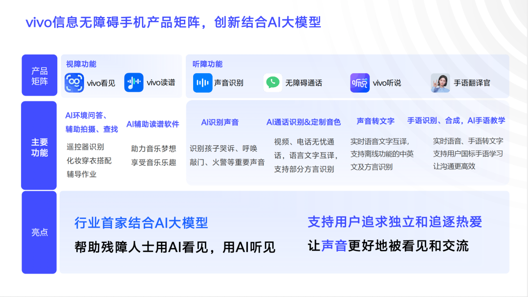 vivo以系統(tǒng)性無(wú)障礙解決方案踐行“科技照亮美好未來(lái)”的企業(yè)使命。在聽(tīng)覺(jué)支持方面,“vivo聽(tīng)說(shuō)”實(shí)現(xiàn)實(shí)時(shí)語(yǔ)音文字互轉(zhuǎn),助力聽(tīng)障人士暢通交流;“聲音識(shí)別”功能可敏銳捕捉環(huán)境關(guān)鍵音;全球首款“手語(yǔ)翻譯官”可識(shí)別1300個(gè)手語(yǔ)詞匯,準(zhǔn)確率超85%,有效打破溝通壁壘。在視覺(jué)輔助領(lǐng)域,“vivo看見(jiàn)”依托自研多模態(tài)大模型,幫助視障用戶(hù)感知環(huán)境、識(shí)別物品保質(zhì)期、輔助育兒與閱讀;“vivo讀譜”則開(kāi)創(chuàng)性地為盲人提供免費(fèi)鋼琴學(xué)習(xí)支持,替代傳統(tǒng)厚重盲譜。從單一功能到生態(tài)共建,從技術(shù)創(chuàng)新到公益落地,vivo始終圍繞“有愛(ài)無(wú)礙”的初心,讓科技真正服務(wù)于人。