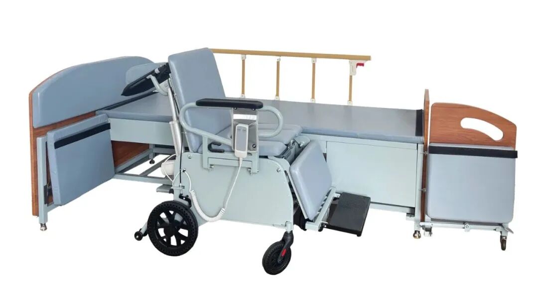床體部分小尾板可進(jìn)行90°開啟,方便護(hù)理人員輕松分離和組合輪椅與床體。