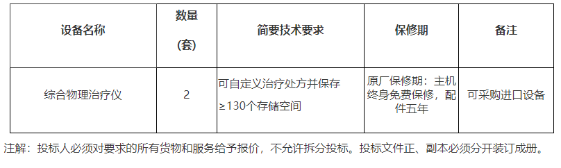 采購需求:采購便攜式肺功能評估儀3套,床旁手功能訓(xùn)練器4套,神經(jīng)功能電刺激(低頻)6套,磁振墊4套,全自動(dòng)康復(fù)病床4套,高頻胸壁振蕩排痰儀2套,氣壓治療儀2套,超聲治療儀1套,智能無線電刺激系統(tǒng)4套,電動(dòng)起立床2套,富血小板凝膠治療儀1套,具體詳見要求招標(biāo)文件第六章《招標(biāo)內(nèi)容及要求》。