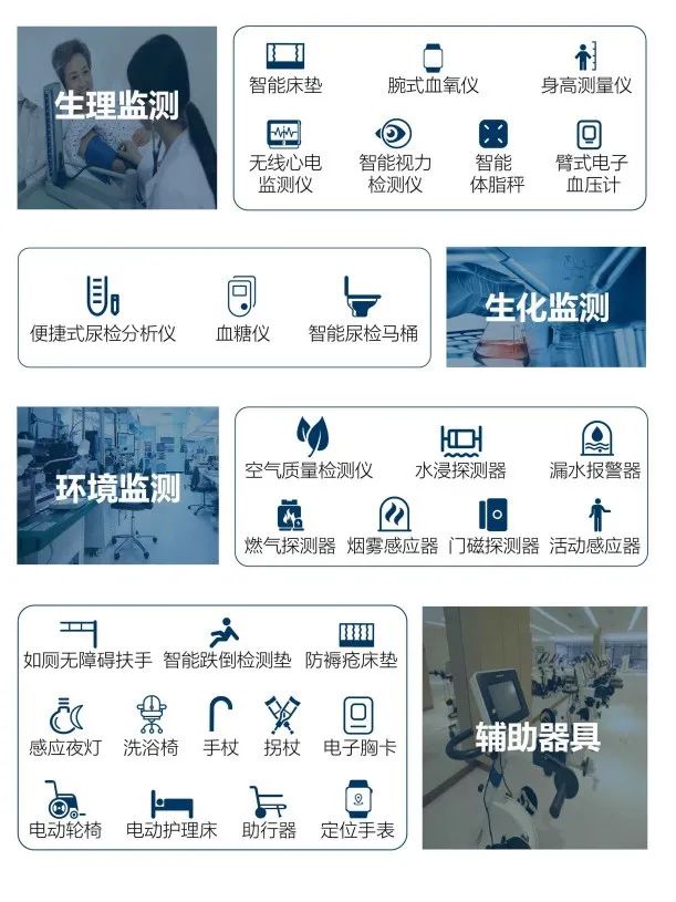 派博的智慧養(yǎng)老“4+3”模型中,“4”代表著四大品類硬件,即生理監(jiān)測(cè)、生化監(jiān)測(cè)、環(huán)境監(jiān)測(cè)、輔助器具,對(duì)應(yīng)的具體產(chǎn)品如下: