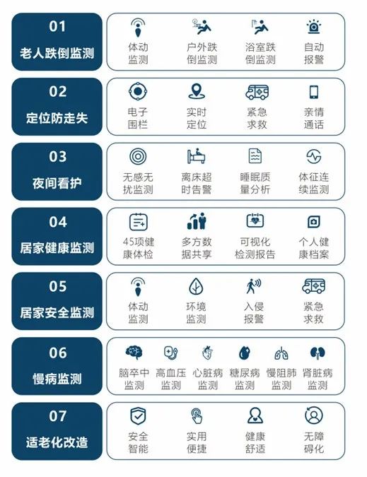 老人跌倒監(jiān)測(cè)、定位防走失、夜間看護(hù)、居家健康監(jiān)測(cè)、慢病監(jiān)測(cè)、適老化改造、居家安全監(jiān)測(cè),是養(yǎng)老服務(wù)中的7大需求。