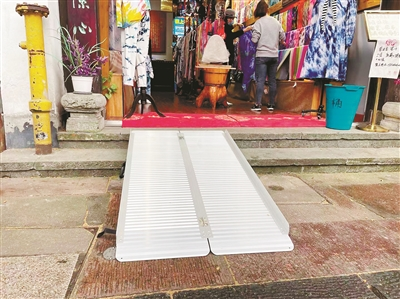 ▲清河坊某商鋪門(mén)口,鋪上了無(wú)障礙臨時(shí)坡道