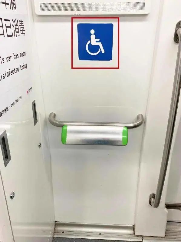 殘疾人專用靠扶位:為保障輪椅人士的乘車安全,每節(jié)列車車廂均設(shè)有專用靠扶位,并在對(duì)應(yīng)的屏蔽門(mén)設(shè)置無(wú)障礙標(biāo)識(shí)。