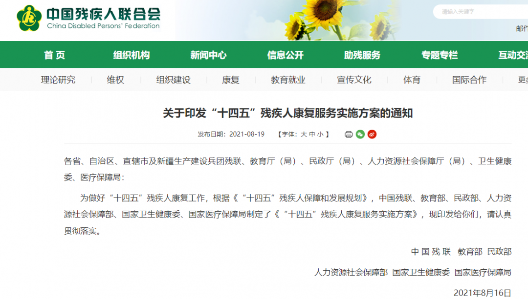 為做好“十四五”殘疾人康復(fù)工作,根據(jù)《“十四五”殘疾人保障和發(fā)展規(guī)劃》,中國殘聯(lián)、教育部、民政部、人力資源社會保障部、國家衛(wèi)生健康委、國家醫(yī)療保障局制定了《“十四五”殘疾人康復(fù)服務(wù)實施方案》,現(xiàn)印發(fā)給你們,請認(rèn)真貫徹落實。
