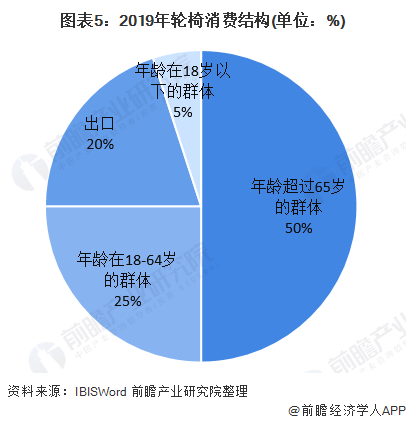 輪椅的主要需求領(lǐng)域?yàn)槔夏耆丝诤蛡麣埲耸浚瑧?yīng)用場(chǎng)景為醫(yī)院,居家養(yǎng)老以及傷殘康復(fù)。從消費(fèi)主力群體來(lái)看,輪椅主要是超過(guò)65歲的老年人使用。目前輪椅在市場(chǎng)的消費(fèi)主要集中在老年人群體,2019年占比約50%,年齡在18~64歲的消費(fèi)群體占比約25%,此外還有約20%的部分用于出口,主要的出口國(guó)家包括美國(guó)、加拿大、澳大利亞、英國(guó)、阿根廷等等。