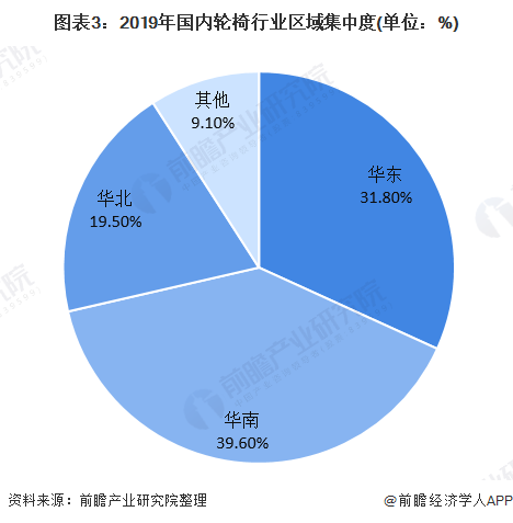我國(guó)輪椅主要的生產(chǎn)基地集中在上海、廣東、江浙和天津等地區(qū),華南、華東地區(qū)占據(jù)主要市場(chǎng)。截止2019年,我國(guó)國(guó)內(nèi)輪椅行業(yè)區(qū)域集中度分別為華東31.8%,華南39.6%,華北19.5%,其他9.1%。