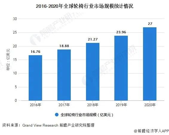 由于人口老齡化,老年醫(yī)學(xué)人口的增加對(duì)輪椅市場(chǎng)需求的擴(kuò)張,以及車(chē)禍數(shù)量的增加,全球輪椅市場(chǎng)規(guī)模逐年上升。