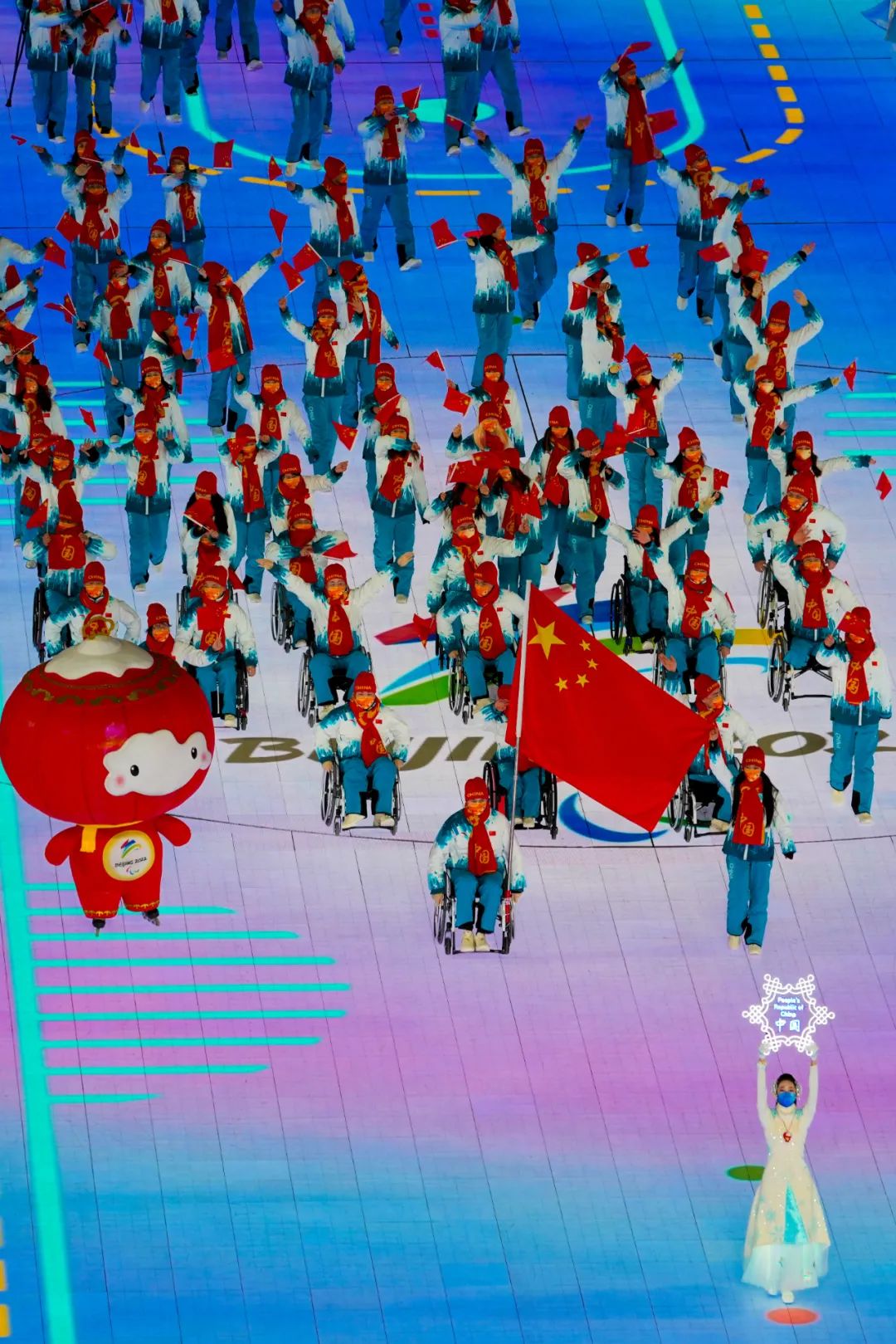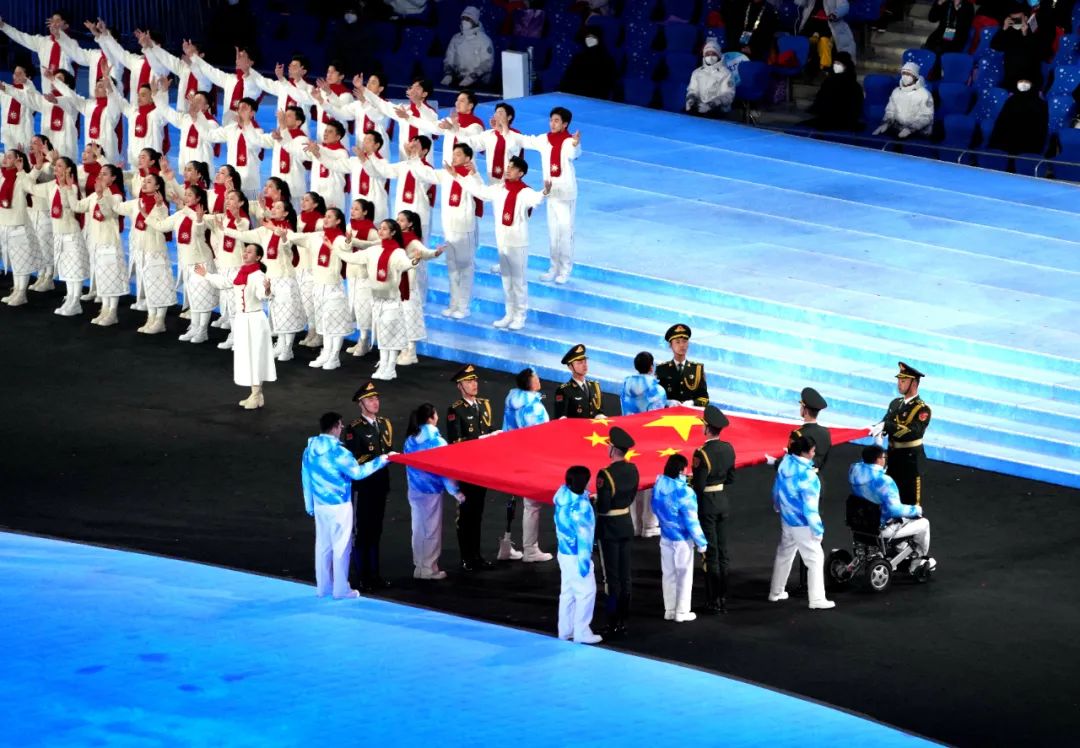 鳥巢中央,一面五星紅旗在殘疾人運動員和為殘疾人事業(yè)做出突出貢獻(xiàn)的8位護(hù)旗手的護(hù)送下,莊嚴(yán)入場。中華人民共和國國歌奏響,五星紅旗冉冉升起,迎風(fēng)飄揚。