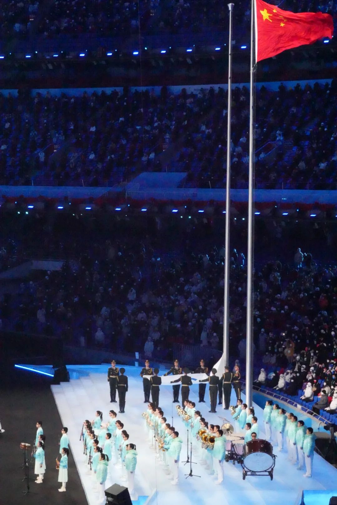 鳥巢出現(xiàn)巨幅五星紅旗,再次響起《歌唱祖國》。