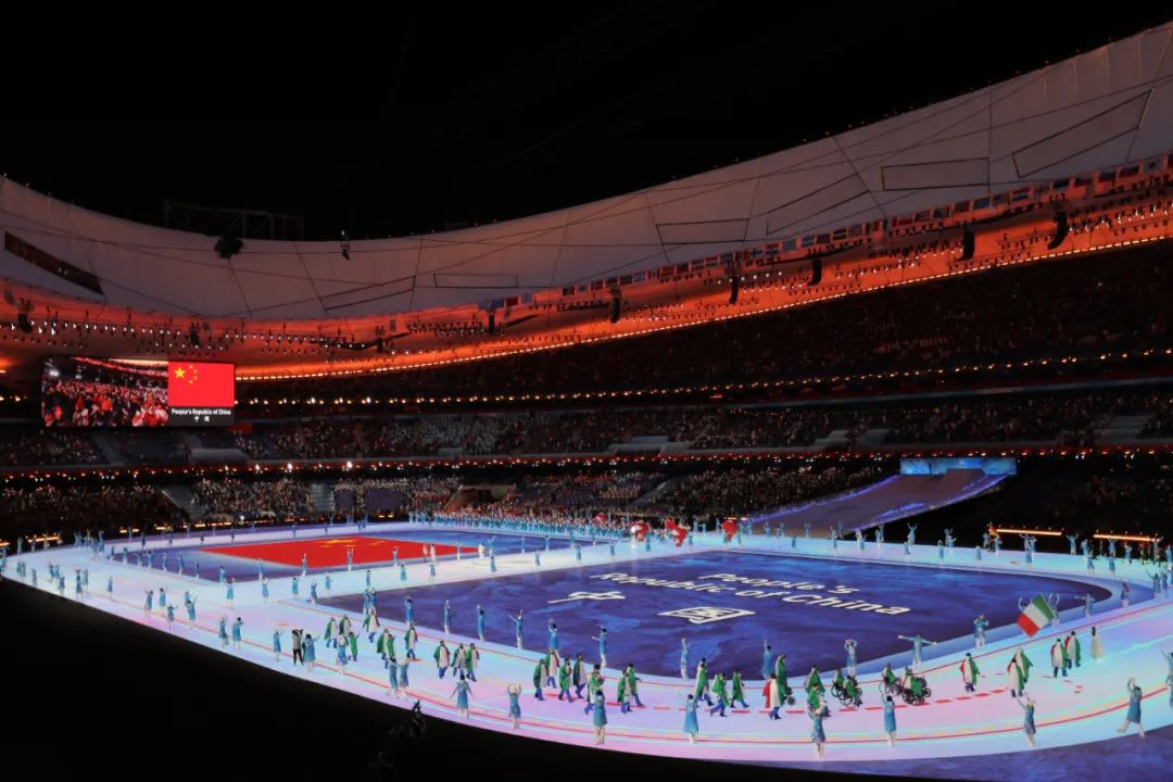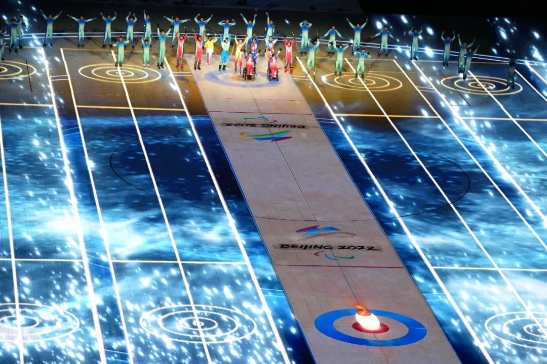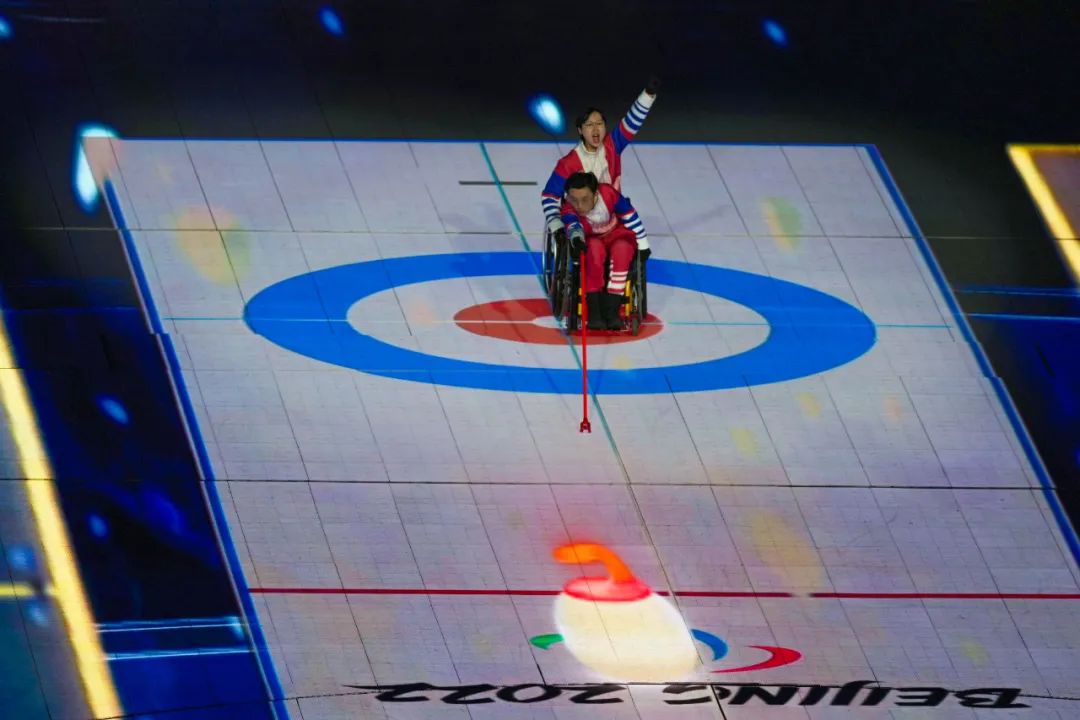 隨著冰壺的擊出,標(biāo)線一格格推進(jìn),從10至1的倒計時數(shù)字在場中心賽道上顯現(xiàn)。當(dāng)時間歸零,冰壺穩(wěn)穩(wěn)進(jìn)入圓心。在全場的歡呼聲中,一屆無與倫比的冬殘奧會拉開大幕。