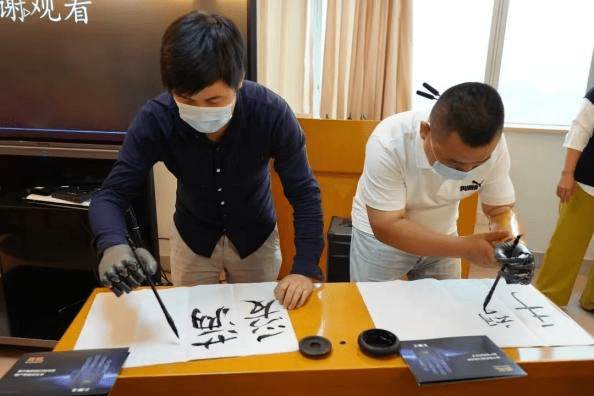 活動(dòng)現(xiàn)場(chǎng),幾位殘疾人朋友佩戴BrainCo強(qiáng)腦科技智能仿生手,手握毛筆寫下“愛滿廈門”、“手望相助”等字