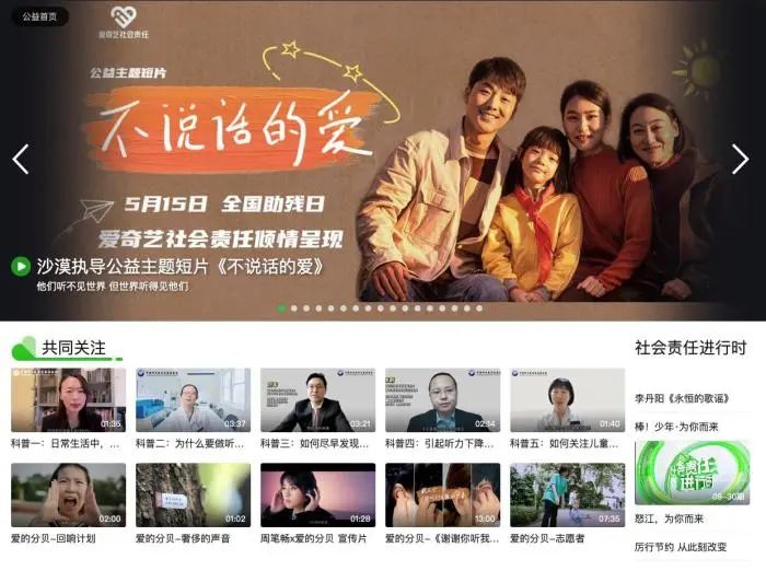在全國助殘日當天,愛奇藝公益頻道傾情呈現(xiàn)公益主題短片《不說話的愛》,短片導(dǎo)演沙漠講述創(chuàng)作初衷,呼吁社會關(guān)心關(guān)愛聽障人群;同時更有蔣龍、蔣詩萌、駱明劼、周彥辰等17名愛奇藝明星志愿者聯(lián)合發(fā)出倡議,關(guān)注聽障群體,用愛溫暖無聲的世界。