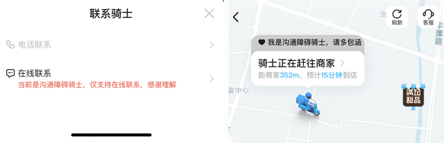在獲得騎手授權(quán)后,餓了么App將向消費者提示當前配送騎手為聽障者。當消費者聯(lián)系騎手時,“電話”選項會默認關(guān)閉,系統(tǒng)將建議用戶消費者與騎手在線文字溝通。“該服務(wù)的核心是尊重騎手的意愿和隱私,只要騎手不主動設(shè)置,消費者看到的訂單頁面仍和普通騎手完全一致。”餓了么聽障騎手體驗負責人胡鹿強調(diào)。