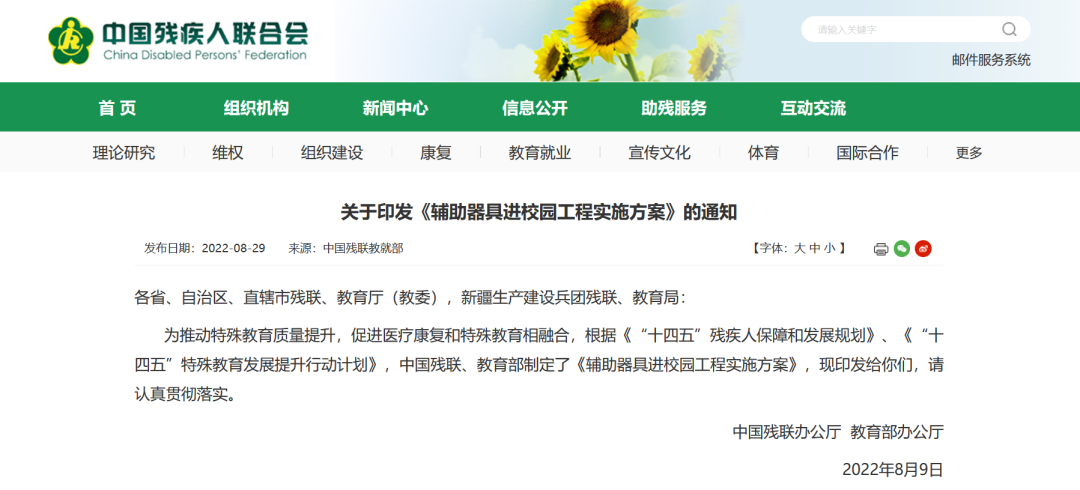 為推動特殊教育質(zhì)量提升,促進醫(yī)療康復(fù)和特殊教育相融合,根據(jù)《“十四五”殘疾人保障和發(fā)展規(guī)劃》、《“十四五”特殊教育發(fā)展提升行動計劃》,中國殘聯(lián)、教育部制定了《輔助器具進校園工程實施方案》,現(xiàn)印發(fā)給你們,請認真貫徹落實。