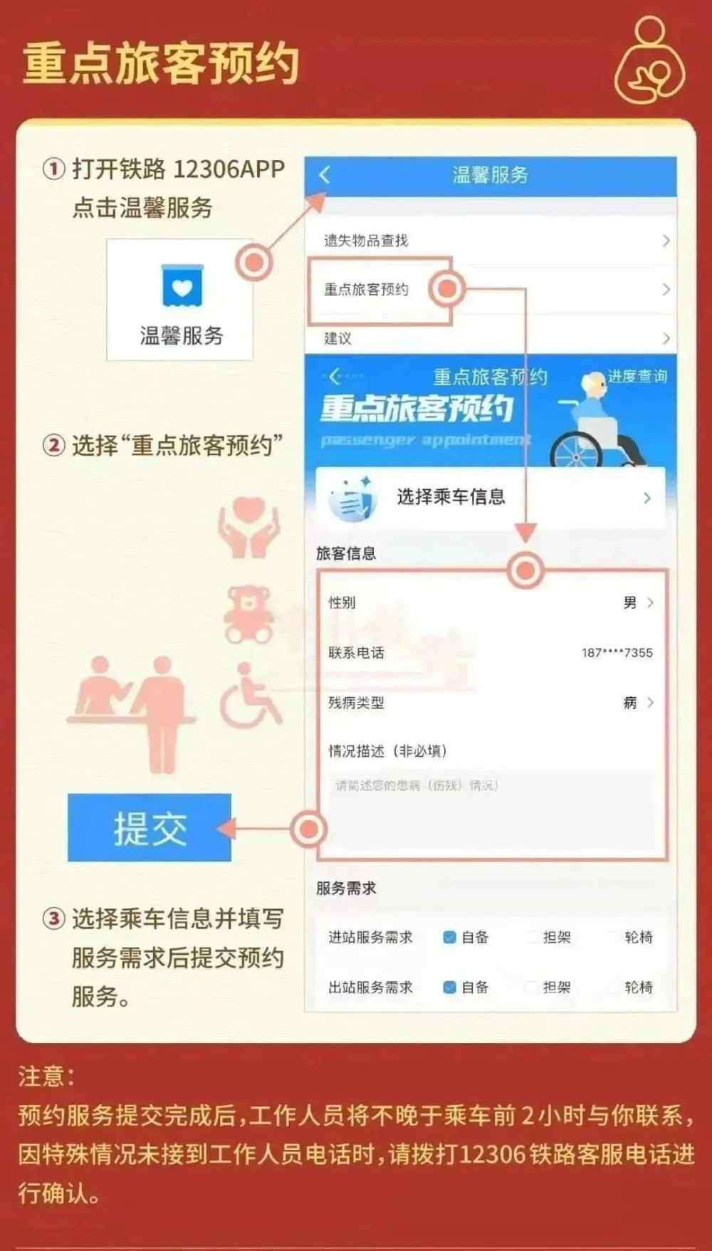 殘疾人小伙伴們作為春運(yùn)的“重點(diǎn)旅客”,除了可通過鐵路12306APP或網(wǎng)站車站窗口、自助售票機(jī)等渠道購買車票,還可預(yù)約享受一系列便民服務(wù)哦↓↓↓