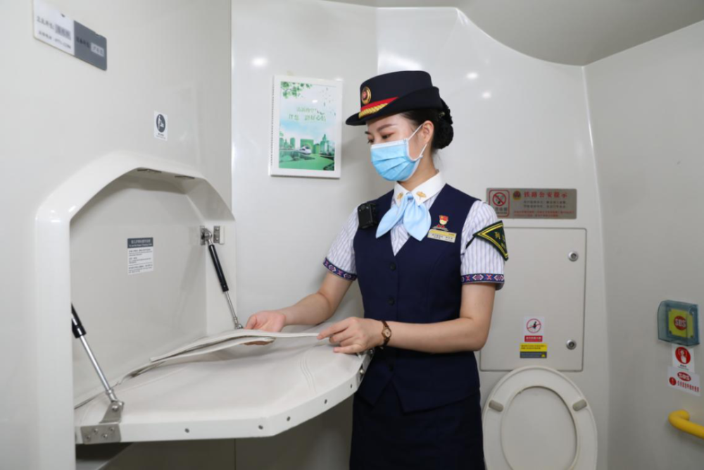 高鐵列車上設(shè)有無障礙衛(wèi)生間。配備安全扶手、SOS報(bào)警器等無障礙設(shè)施和母嬰護(hù)理臺,為重點(diǎn)旅客提供旅途便利。