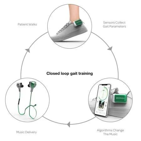 該數(shù)字療法的使用者需要將傳感器夾在鞋子上,戴上耳機(jī)即可開始與專業(yè)音樂治療師的視頻會(huì)話。傳感器收集患者的基線步態(tài)數(shù)據(jù),算法持續(xù)接收來自傳感器的實(shí)時(shí)數(shù)據(jù),根據(jù)用戶數(shù)據(jù)實(shí)施臨床干預(yù)措施?;颊呗犞魳冯S著節(jié)拍行走,算法不斷評估患者行走能力并提供聽覺刺激。除了數(shù)字療法外,MedRhythms還提供遠(yuǎn)程的神經(jīng)音樂療法,主要面向腦損傷、阿爾茨海默癥、帕金森癥、發(fā)育障礙和多發(fā)性硬化癥,通過音樂療法幫助患者恢復(fù)語言、行動(dòng)、認(rèn)知等方面的能力。