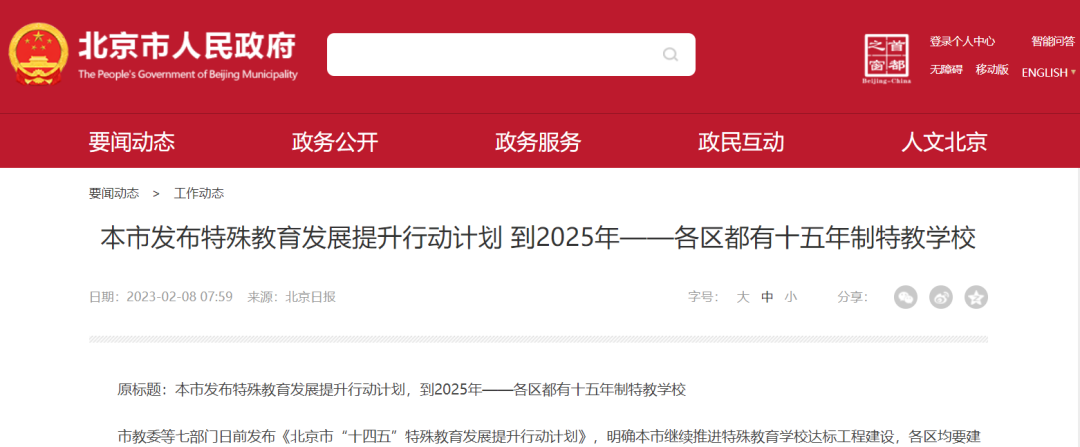 北京市教委等七部門近日發(fā)布的《北京市“十四五”特殊教育發(fā)展提升行動計(jì)劃》明確,到2025年,北京市特殊教育體系進(jìn)一步完善,各區(qū)均要建有一所從幼兒園到高中全學(xué)段銜接的十五年制特殊教育學(xué)校,并根據(jù)不同學(xué)段、不同專業(yè)配足配齊特教教師。